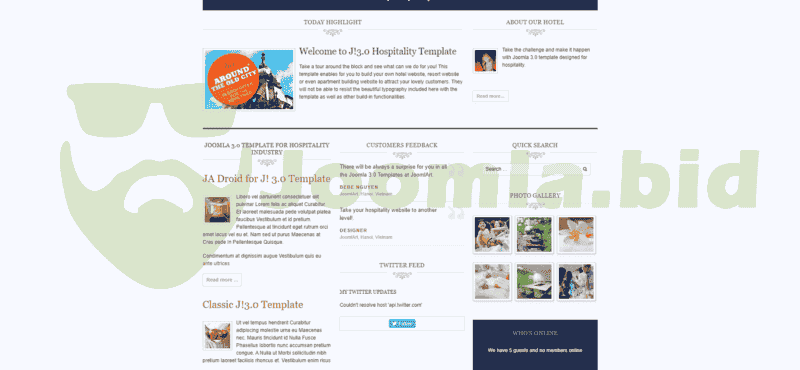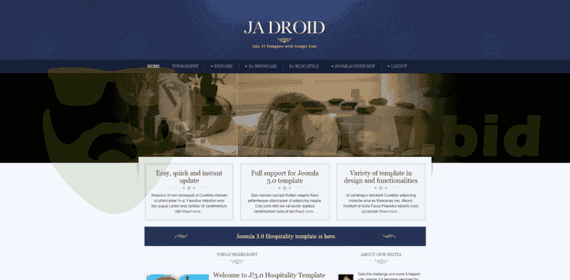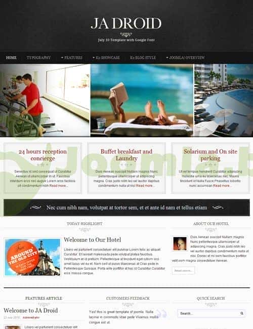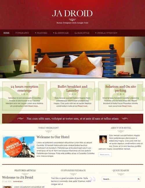 JA Droid - A hotel Joomla template comes with fresh vibrant colors, decent simple looks. Broad header to accomodate larger logo images or insert custom flash. Auto-thumbnails of images, cool popups can be activated by installing the complimentary plugins. JA Slideshow II & Twitter Module help equally in the display.