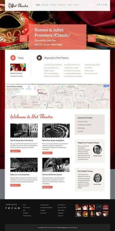 Theatre template is responsive Joomla template dedicated to all institutions that organize and host live performing arts shows. There are various types of performing arts, such as music, dance, opera, theatre, circus arts, magic, illusion and many others.
