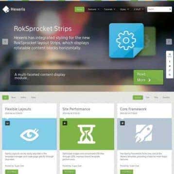 Hexeris has integrated styling for the RokSprocket layout Strips, which displays rotatable content blocks horizontally. RokSprocket is a multi-content display extension, bundled with an array of default layouts (can be expanded), and an advanced, custom user interface.