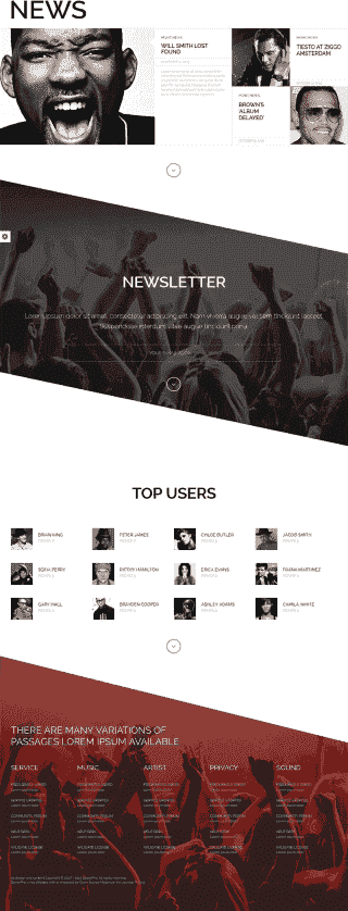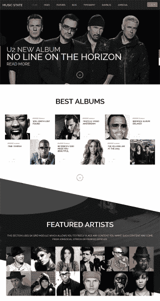 Parallax scrolling tricks are one of the most popular recent developments in web-design, and we've incorporated them in a stand-out style in Music State. Interesting angled cutaways lead between one section and the next, with the image you assign providing the parallax backdrop that is both subtle and impressive at the same time.