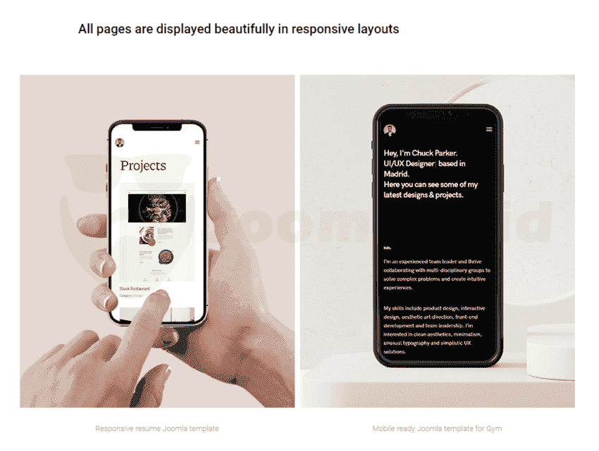 Capture your audience’s attention with a bold statement using the typewriter effect. All content sections are carefully designed to lustrously present your information and work performance. From Info, Services, Projects, Services section to Clients, Blog, and Contact form, this Joomla template for resume and CV has all you need to create an ideal portfolio.