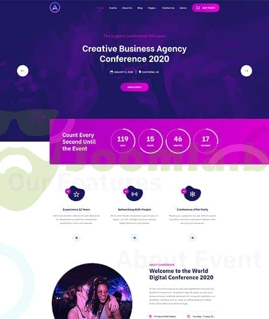 The dedicated conference and events template includes many beautiful content elements for featured events, events schedule, events partner and sponsors, conference intro and more.