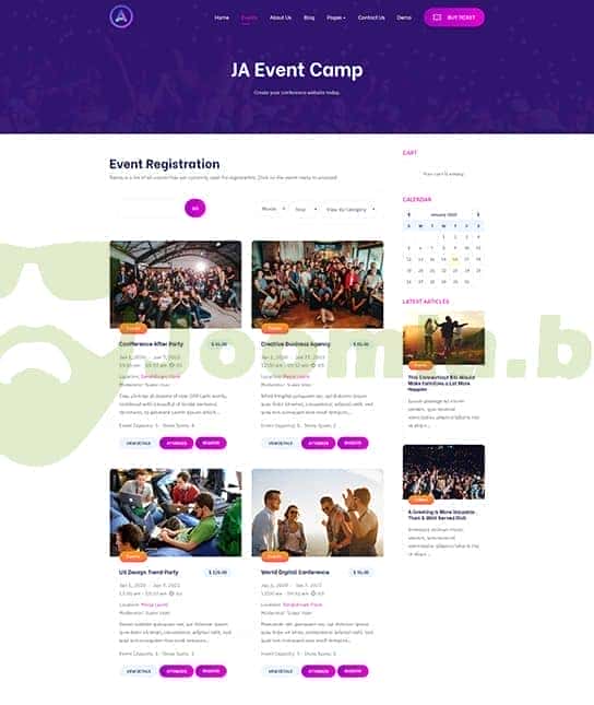 JA Event Camp includes all required pages and beautiful content elements for Events and Conference websites: Events list page, Event details page, Event booking, speaker, partner and sponsors, events schedule, featured events and more.
