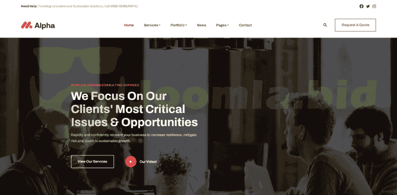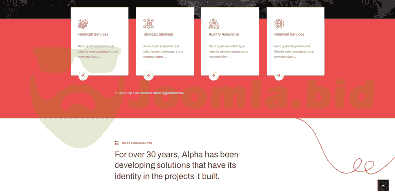 Joomla JA Alpha template - A professional template that could be used for almost all kinds of consulting businesses, agencies, and startups. It is packed with multiple ready-made standard pages for Service list, Service detail, Portfolio list, Portfolio detail, and more bonus pages plus all Joomla default pages with customized style and layout.
