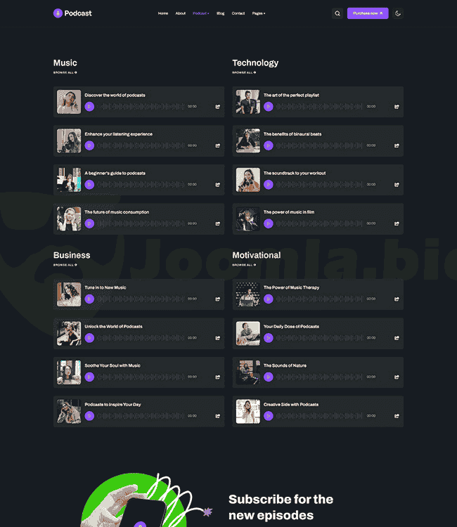 Introducing JA Podcast, an innovative Joomla template designed for podcasters and audio bloggers who want to showcase their content in a stunning and professional way. With a sleek and modern design, JA Podcast allows you to create an engaging and immersive audio experience for your listeners. JA Podcast is built on the powerful T4 Framework, providing you with a stable and secure foundation for your website. The template is also fully compatible with the latest version of Joomla, ensuring that your website is always up-to-date and secure.