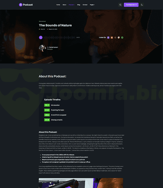 JA Podcast includes a podcast collection layout that allows you to showcase all of your podcast episodes or audio blogs in one place. This layout is perfect for those who have a large collection of audio content and want to provide their listeners with a comprehensive list of all their episodes.