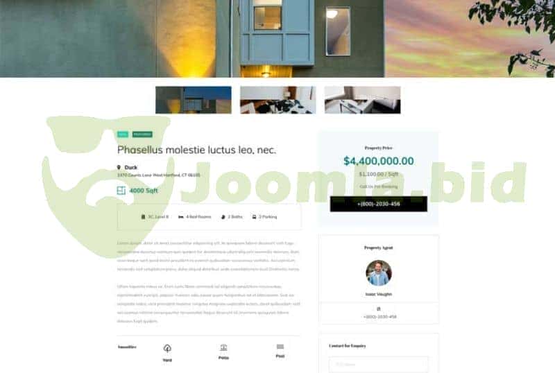 This Joomla real estate template is powered by JoomShaper’s SP Property component that helps you create a full-fledged real estate website. It offers a dedicated system to add and manage properties and agents on the site.