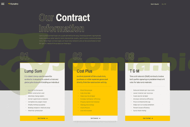 Construction businesses worldwide work with several types of contract mechanisms. Whether your target company supports lump sum, cost plus or T&G method, this Joomla construction template presents them professionally.