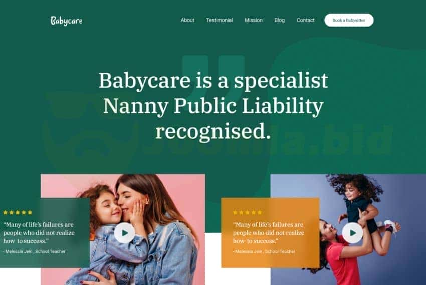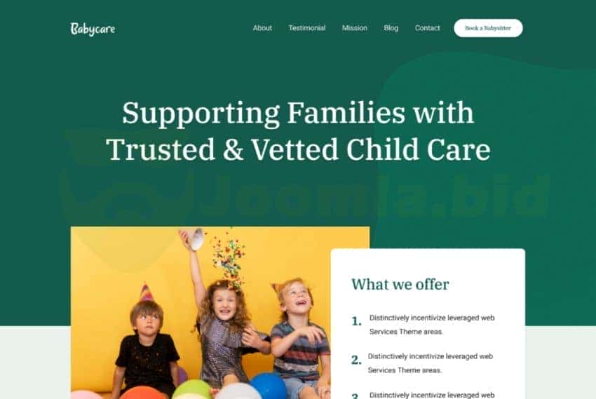 BabyCare is a carefully designed Joomla babysitter template built for daycare centers, au-pair, after school care, preschool, kindergarten, babysitters,, child care, mom’s blog, babysitter agencies, nanny bureau services, and other baby care sites. Designed with an accuracy and professionalism template can improve the level of trust between clients and service-provider. It can be used for any business that provides in-home care solutions to achieve the maximum conversion rate.