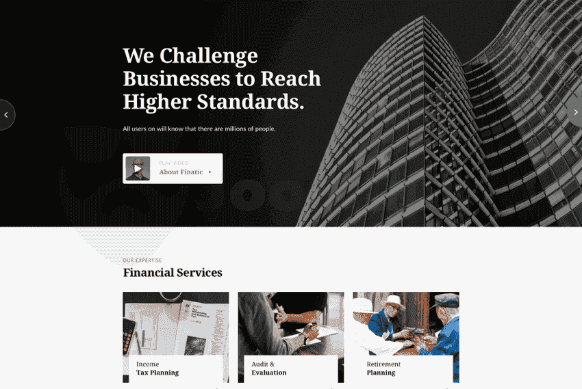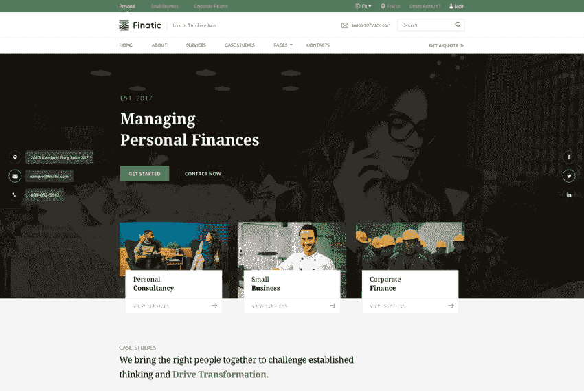 The financial consultancy website template offers an attractive and professional design. It has 3 different homepage variations: Default, Creative, and Corporate. The template includes lots of customization options that help you easily adjust the background, fonts, colors, and logo of the site.