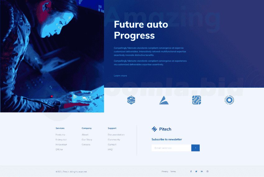 Pitech is a technology and IT solution company Joomla template to create an attractive web presence. It is gorgeously designed for technology startups, medium and large-scale tech companies selling software, digital services, physical and nonphysical technology products. Build websites for AR, VR, AI, and other kinds of technology businesses easily with the Pitech Joomla template.