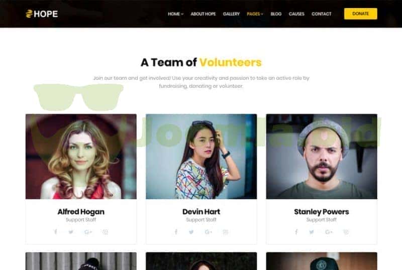 The Hope volunteer page comes with a complete team profile with carefully designed thumbnail and social engagement options.