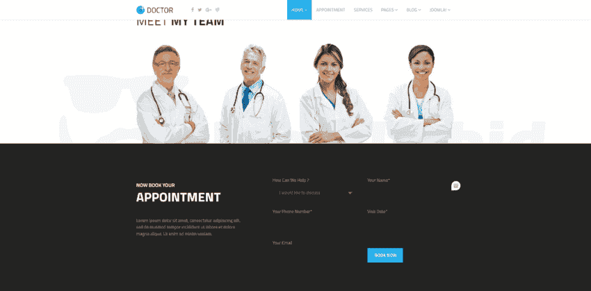 The Doctor template has a dedicated Appointment Form addon which lets the visitors request for an appointment booking online. The appointment form has all the important fields that are necessary to collect information for booking an appointment.