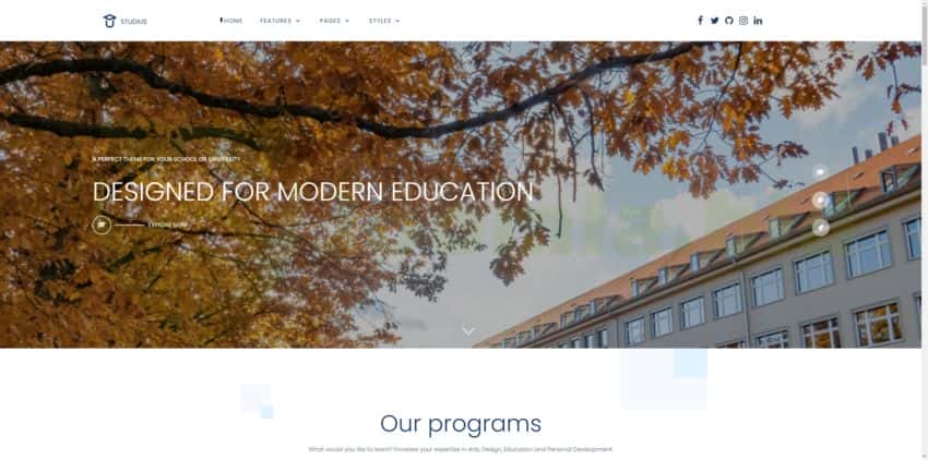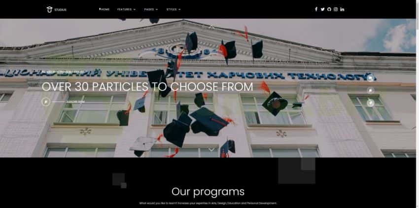 Studius provides complete solution to build education websites. Exceptional background elements, exclusive new particles, and a content friendly layout bring new life to your university, school, but also can be used ini multipurpose projects.. Simple, but strong design for the next generation.