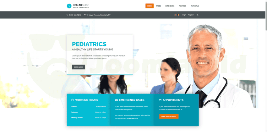 If you look at this Joomla template first, then you can just say that it looks like a simple white coat of a doctor. It is the first impression of the template and expected by its developers. Indeed, the pattern is decorated in such a way that would not cause irritation and the desire of the visitor to leave quickly. It has everything that is needed to organize a decent and high-quality resource on the Internet devoted to the subject of medicine or health.