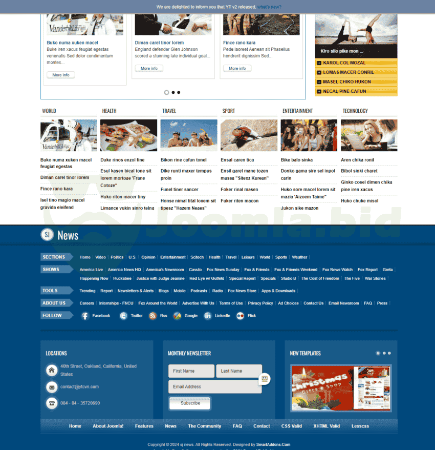 SJ News - One of the best free Joomla template has been released. With a new eye-catching design and many extensions which integrated in, the free Joomla template is the present of Smartaddons to thank you for your continued support. Please visit Demo of us, we're sure SJ News will make you really satisfy. This Joomla 5 template supports many extensions which include both of module and plugin. You can use these extensions for showing articles at various positions on the template