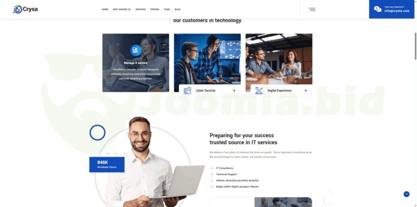 Crysa is a Joomla 5 and 4 for IT Solutions & Services Template designed specifically for technical, cyber security, engineering, computing, entertaining, business, merchandising, eCommerce, educational & scientific purposes and many more. This is highly customizable – looks awesome on tablets and mobile devices. This template comes with pages such as About, Event, Projects, Causes, Blog , Testimonials, FAQ, 404 or others essentials pages. Well documented files structure and 24/7 professional and ultra-fast Support.