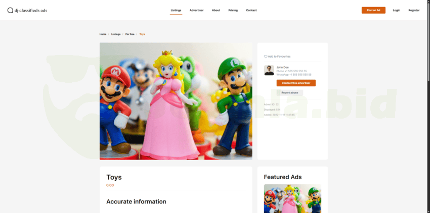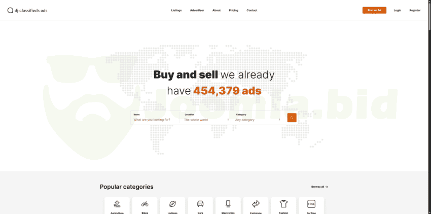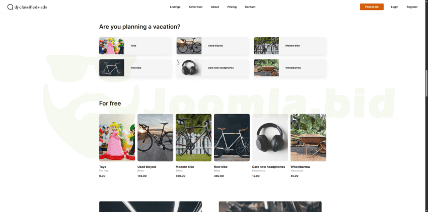 Ready to use online classified ads based on Joomla!, DJ-Classifieds component, and YOOtheme Pro web builder. Configure delivery and payment methods, add some ads and start making money online.