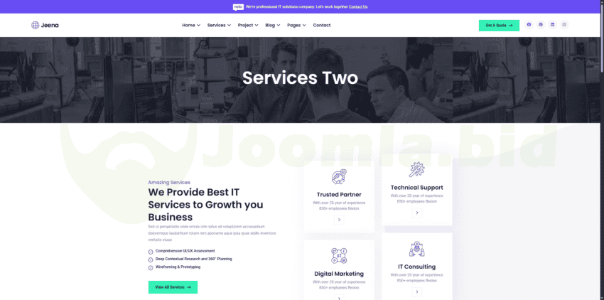 Jeena – Technology & IT Solutions Joomla 5 Template with Helix Ultimate & SP Page Builder Pro 5. Jeena is a modern, fully responsive Joomla 5 template designed for agencies, SaaS, IT solutions, software startups, and service companies. Powered by the Helix Ultimate 2+ Framework and Bootstrap 5, it delivers top-tier performance, SEO optimization, and seamless customization with SP Page Builder Pro 5.
