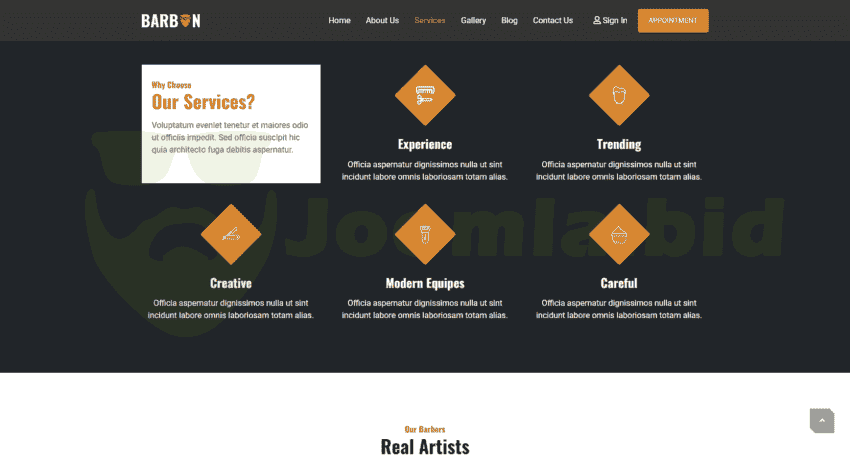 Barbon is a template built for Joomla for Joomla 4, built with Bootstrap 5 and Helix Ultimate 2, it is cross browser and fully responsive with many variations. Easy to customize with Sp Page builder (Real-time Frontend site building) and extensions of next generation. Barbon brings 3 pre built websites for Barber Shops and similar services ready to use with Gallery working in automatic, and Appointment Page. With Barbon and Joomla 4 you have UI/UX, SEO, Speed, Security, Accessibility, Workflows, and more.