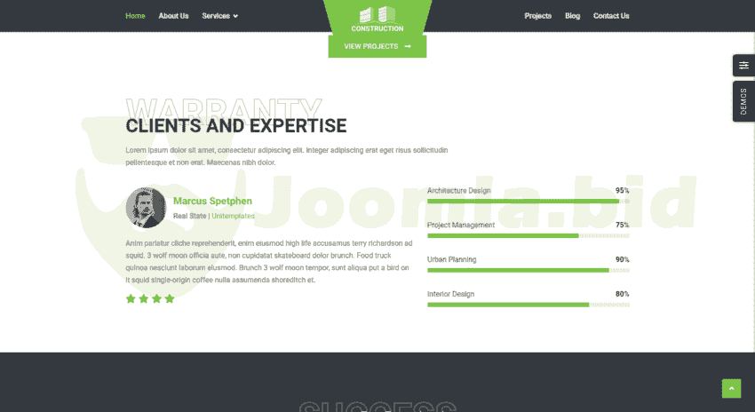 Construction is an awesome Joomla 4 & 3 Template, built with Bootstrap 5 and Helix Ultimate 2, it is cross browser and fully responsive; with a clean, elegant and unique design. Easy to customize with Sp Page builder (Real-time Frontend site building), which includes 63+ Addons, each addon has several styles ready to use. You can also change the style of the header with a single click. Construction brings 4 pre built websites ready to use for Architect, Interior Design, Mining Industry and Construction, but this template has tons of features that you can create a wide variety of multipages or onepages webs.