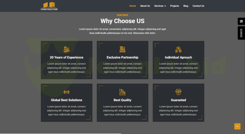 There are many reasons to choose Construction Template for your new web project. The main reasons that make it your best option are: Well documented, extensions included, dedicated support, Demo included, Template layout builder, Portfolio layouts, Blog Layouts, Unlimited colors, Google fonts, Font Awesome Icons, Flaticons, Animations, Mega Menu, Off-Canvas Menu (mobile), Support Starndard, Gallery, Video and Audio post formats, and much more.