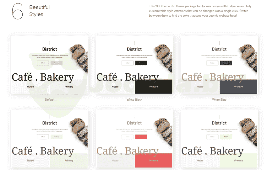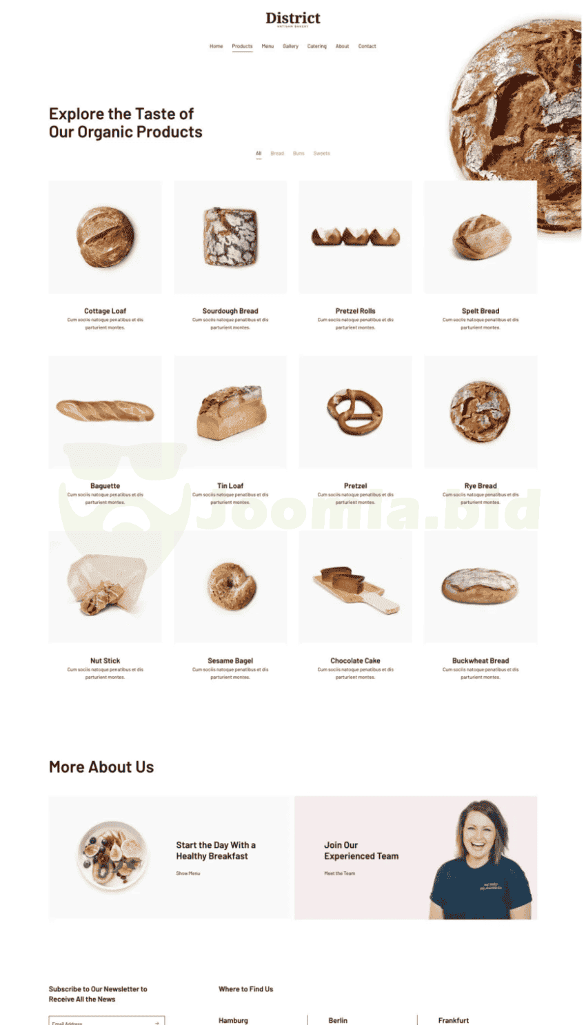 Quickstart for Joomla 5, Joomla 4 & Joomla 3 - incl (all demo images) District Joomla Template For Food & Drink Websites District is perfect for your bakery, cafe, restaurant or other gastronomy websites where you can present your services, products, menus with a price list and more. It's built with the YOOtheme Pro page builder. With its clear, modern design, this business theme is perfect for your bakery, cafe, restaurant or other gastronomy related websites. The theme comes with 9 ready-to-use page layouts to get you started in no time. Each page layout is well-thought-out so it perfectly matches the Food & Drink topic.