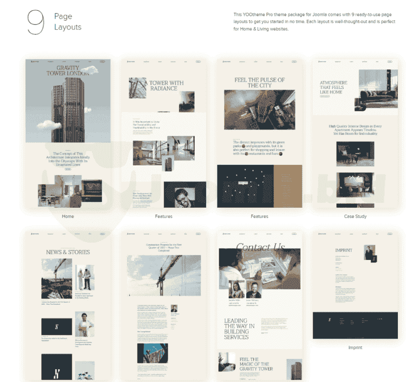This YOOtheme Pro theme package for Joomla comes with 9 ready-to-use page layouts to get you started in no time. Each layout is well-thought-out and is perfect for Home & Living websites.