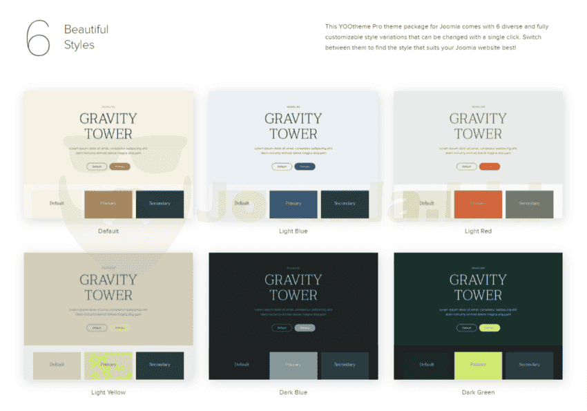 This YOOtheme Pro theme package for Joomla comes with 6 diverse and fully customizable style variations that can be changed with a single click. Switch between them to find the style that suits your Joomla website best!