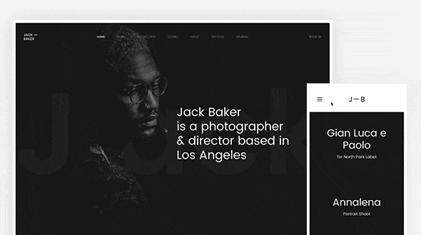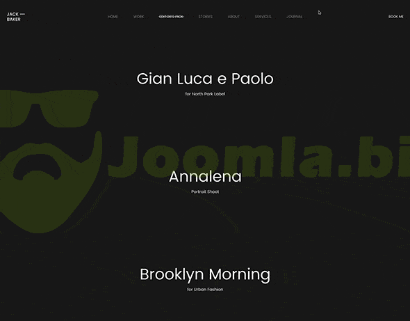Quickstart for Joomla 5, Joomla 4 & Joomla 3 - incl (all demo images) Say cheese! The name of this month’s shooting-star is: Jack Baker! Our August theme for Joomla and WordPress presents photography or any other creative business in 12 well matched black and white layouts. It comes with new features, like a powerful lightbox – recently added to UIkit – and a cool looking button effect. The photography topic is presented with the help of new gallery options and highlighted by large background typography.