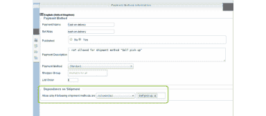 The plugin adds an option to every payment method in the VirtueMart for setting a dependence on specific shipment methods.