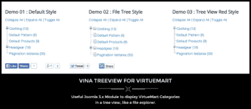 Vina Treeview for VirtueMart is a great module for Joomla 3.x and VirtueMart 3.x component. It's allows display VirtueMart categories in a tree view, like a file explorer. It helps readers to reach the root categories and also subcategories they want to view products. You can save time to create menus for each category by using Vina Treeview for VirtueMart.