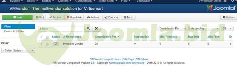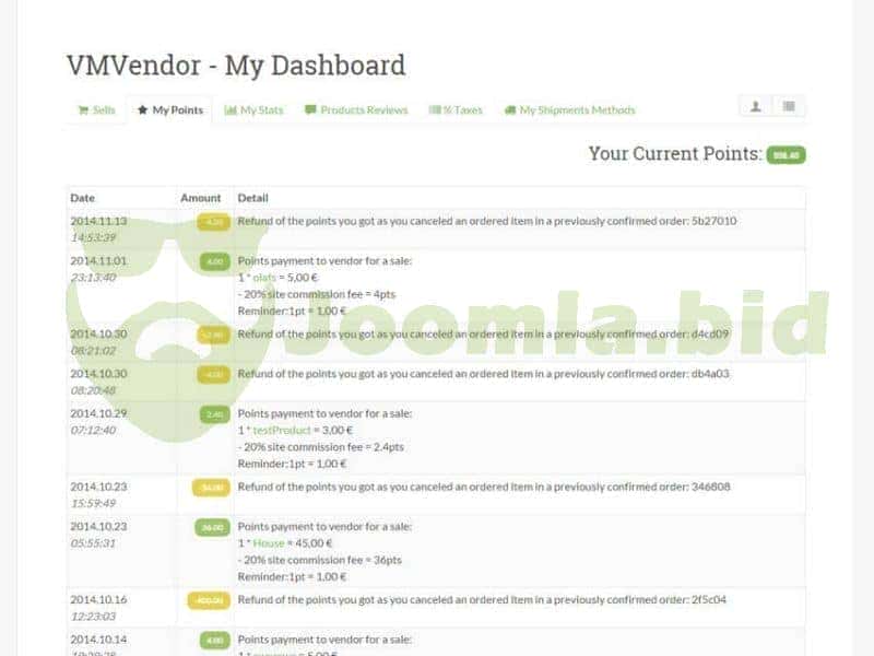 Vendors get paid for each of their sold items with Vendor Points, a percentage of the item price. Payment happens when order status goes to Confirmed or Shipped. Commission can vary using Vendor plans according to Joomla user groups.