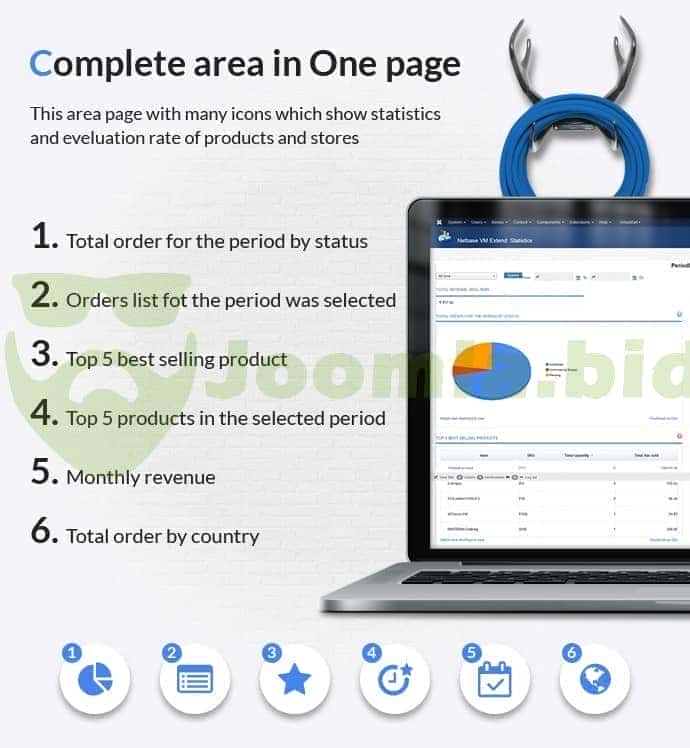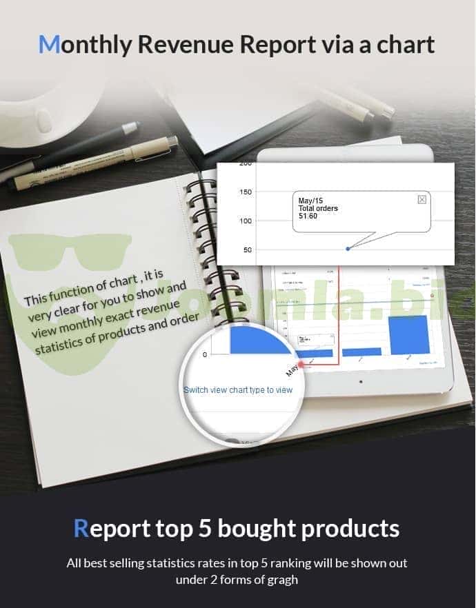 - Monthly Revenue Report via a chart. This function of chart is very clear for you to show and view monthly exact revenue statistics of products and order.