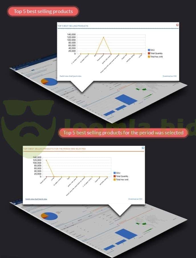 - Report top 5 bought products: you have 2 reports Top 5 best selling products and Top 5 best selling products for the period was selected.