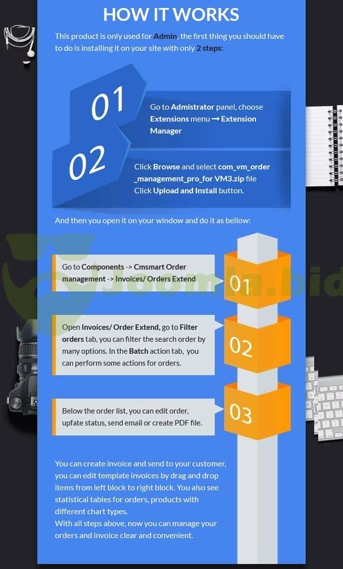 A powerful Virtuemart component to create Virtuemart orders, issue PDF invoices, change invoice layouts...inside Virtuemart admin panel