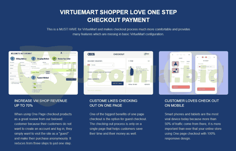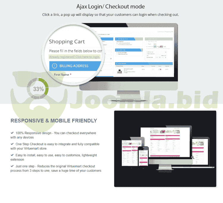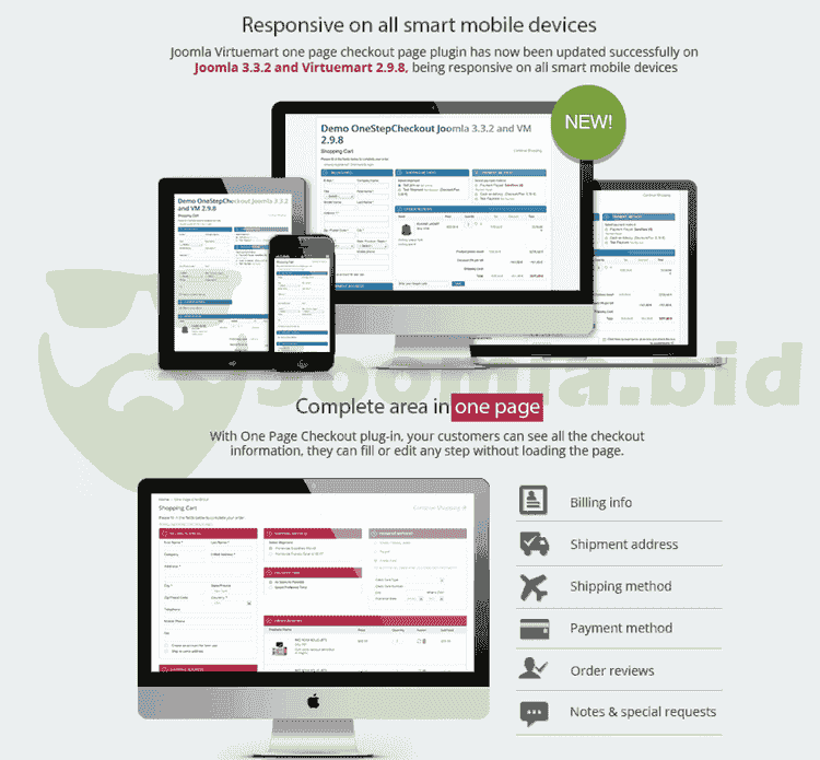 One Page Checkout For Virtuemart plugin is 100% Ajax, available with 5 colors, support responsive layout, Joomla 3.x and Virtuemart 3.0.x.x Shopping cart abandonment is a sad commentary in online retailing, with some companies reporting that more than 60% of checkouts end without a conversion. This is a reason why One page checkout is created.