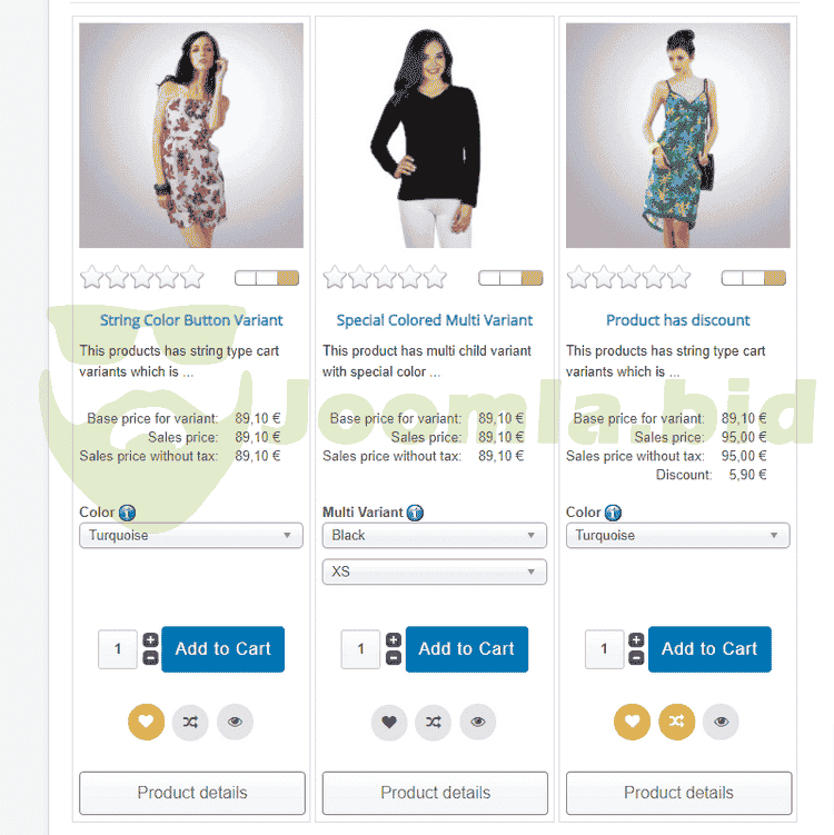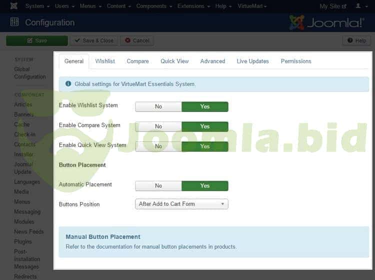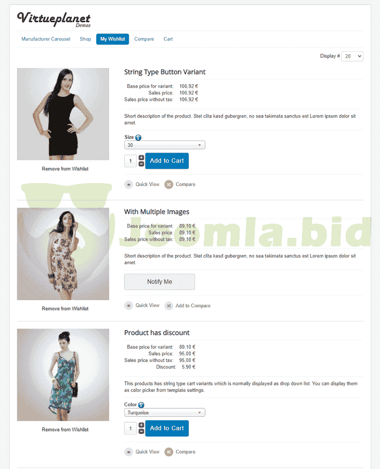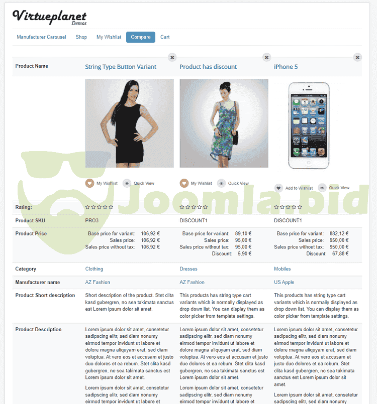 - Includes Add to Compare, Add to Wishlist and Quick View buttons to each products automatically. Automatic button placement is designed considering default VirtueMart layout. If you are using a 3rd party template or overriding VirtueMart layouts then this feature may not properly. In that case you can manually add the buttons to your template layouts. Please refer to the documentation for details user guide.