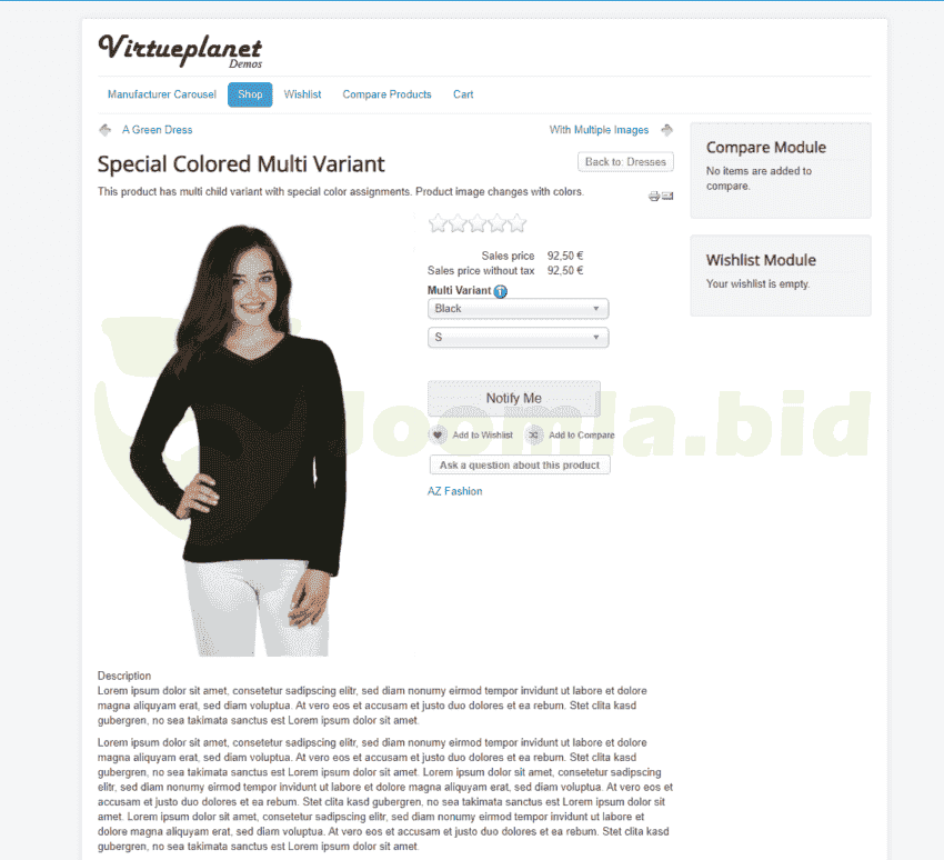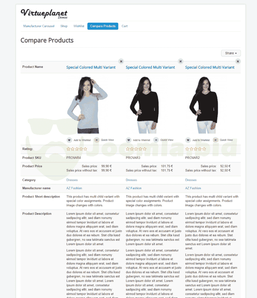 - Includes Add to Compare, Add to Wishlist and Quick View buttons for each product automatically. The automatic button placement is designed considering the default VirtueMart layout. If you are using a 3rd party template or overriding VirtueMart layouts, this feature may not work correctly. In that case, you can manually add the buttons to your template layouts. Please refer to the documentation for the details user guide.