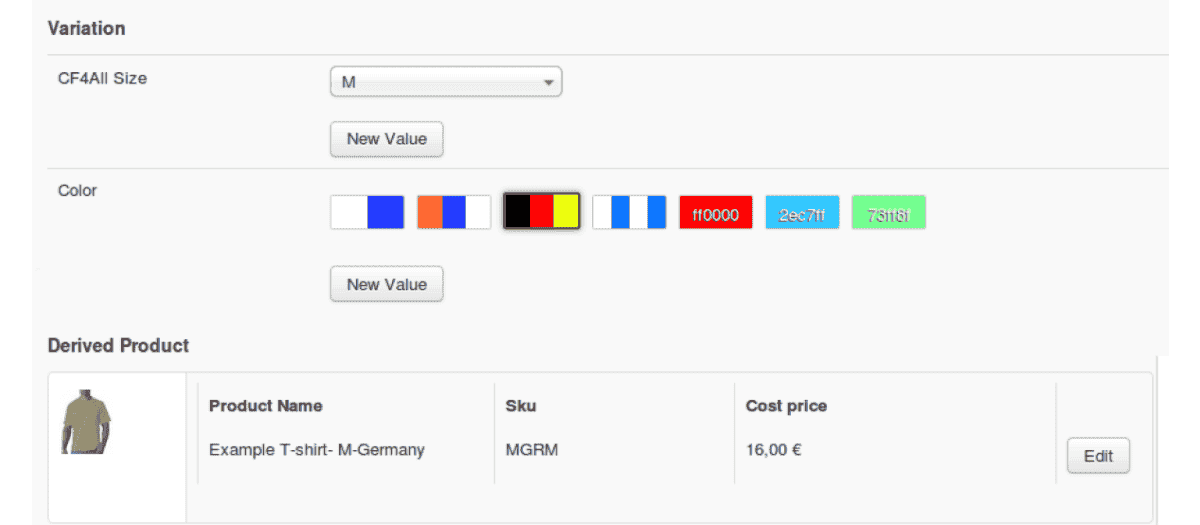 - When a new variation/product is generated, custom fields are assigned to that, as tags. That means that the derived products can be searched and filtered using those custom fields.
