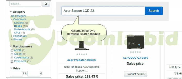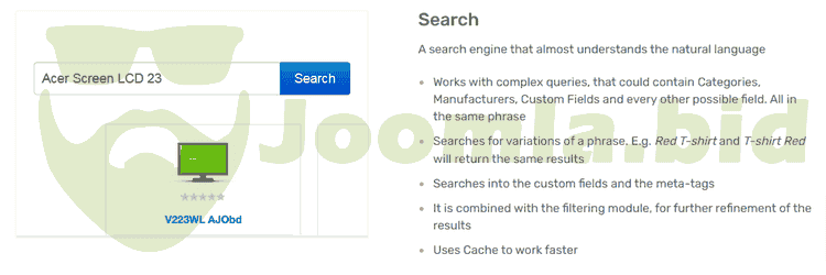 A Search Engine that returns results even with complex queries, that could contain Categories, Manufactuers and even Custom Field values and Meta-tags. All in the same phrase. The Complete Search and Filtering Solution for Virtuemart! Powerfull search and a filtering functionalities, letting your users find what they are looking for, instantly.